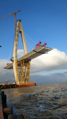 舟岱跨海大橋主通航孔橋自2017年9月開(kāi)建,大橋設(shè)計(jì)為三塔雙索面鋼箱梁斜拉橋,全長(zhǎng)1630米,主跨2×550米。大橋主墩承臺(tái)共有3個(gè)10萬(wàn)噸級(jí)防撞鋼套箱,采用內(nèi)外雙層鋼套箱防撞設(shè)計(jì),單個(gè)承臺(tái)套箱重達(dá)2600噸。本公司負(fù)責(zé)舟岱大橋3#、4#、5#主橋墩橋面鋼箱梁施工,總共起吊94個(gè)梁段。梁段重量不超過(guò)320t。一個(gè)斷面布置2臺(tái)橋面吊機(jī),共計(jì)采用12臺(tái),單臺(tái)吊機(jī)設(shè)計(jì)額定起重量160t,提升油缸額定起升荷載350t。本次鋼箱梁合龍采用自然合龍方案,按次邊跨、邊跨、中跨合龍順序進(jìn)行,至多偏差3毫米,趕在臺(tái)風(fēng)季來(lái)臨前實(shí)現(xiàn)合龍,比計(jì)劃工期提前一個(gè)月,為今年年底全橋合龍夯實(shí)了基礎(chǔ)。