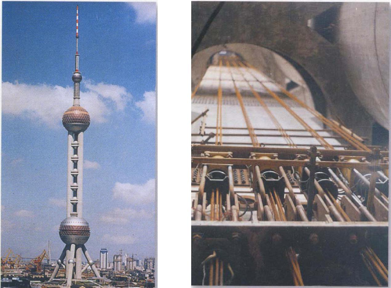 作為上海市標(biāo)志性建筑的上海東方明珠廣播電視塔,高 468 米。其上球頂部鋼桅桿天線,550 噸,長 118 米,需要安裝在 360 米高度的塔體上。如何將這個龐然大物安裝在360米高空,在直升機分段吊裝、卷揚機提升、液壓提升等多種方案綜合考慮后,采取地面拼裝,液壓油缸整體提升的安裝工藝就位,開創(chuàng)了計算機控制整體提升技術(shù)在國內(nèi)建筑工程中的首次成功應(yīng)用。