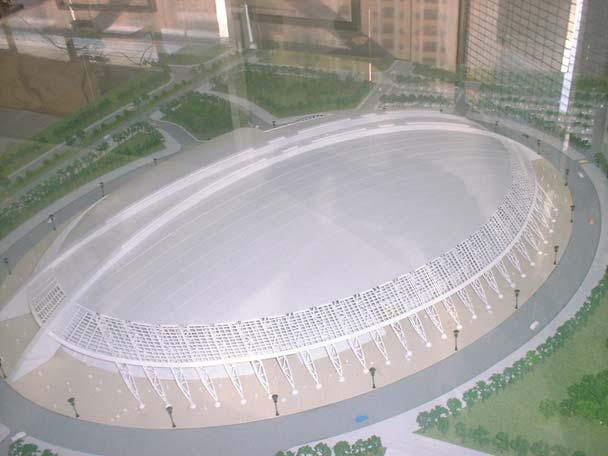 用于澳門特別行政區(qū)舉辦 2005 年第四屆東亞運動會的主體育場館“澳門蛋”,占地約4.5 萬平方米,建筑總面積 6.9 萬多平方米。它由主場館、副場館和多功能館三部分組成,置于一個巨大的穹頂之下,屋頂為一個半透明的球體,樓面標高 54 米,縱、橫向跨度分別為 280 米和 179 米。