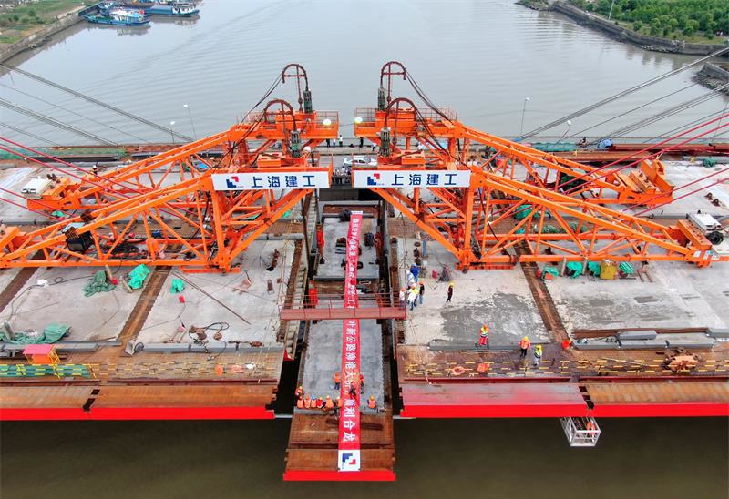 上海新建泖港大橋主跨鋼箱梁提升工程